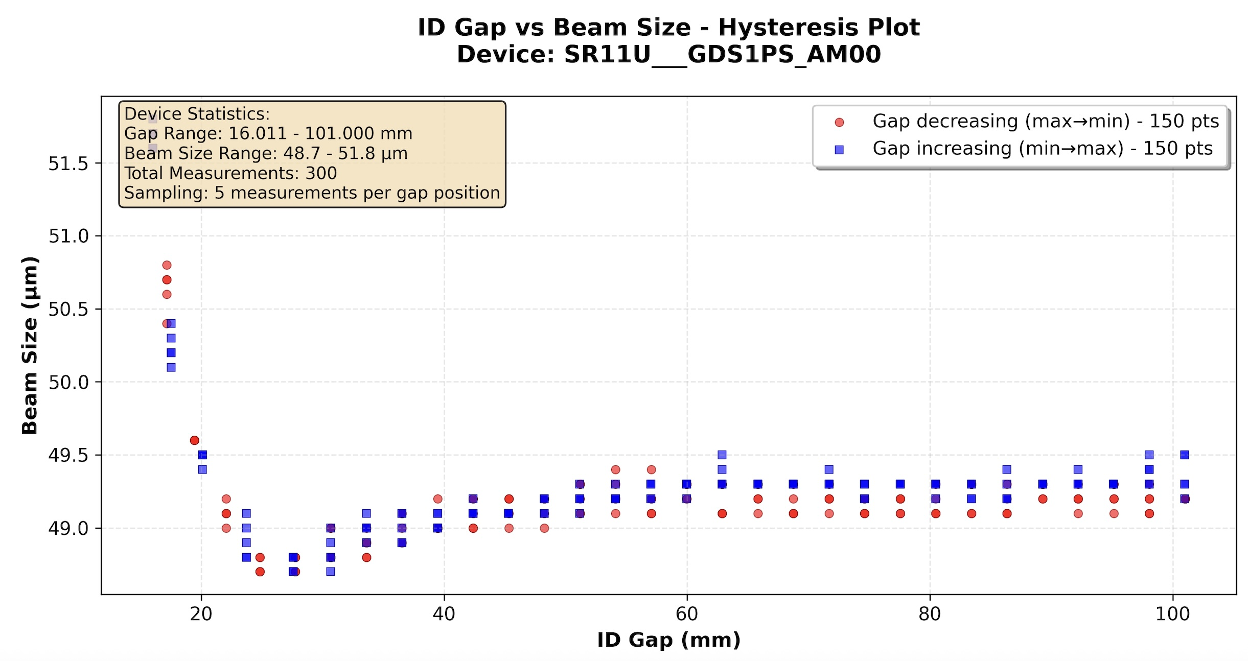 Automated Physics Experiment Results: Hysteresis plots showing beam size variations across insertion device gap ranges, demonstrating the framework’s ability to orchestrate complex multi-stage physics experiments from natural language instructions.#