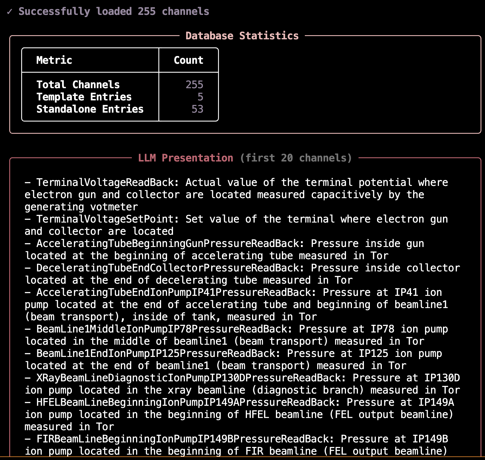 The LLM receives the formatted database and atomic query, then identifies all matching channels based on semantic meaning rather than exact string matching. This allows queries like “beam current” to match channels with descriptions containing corresponding concepts.