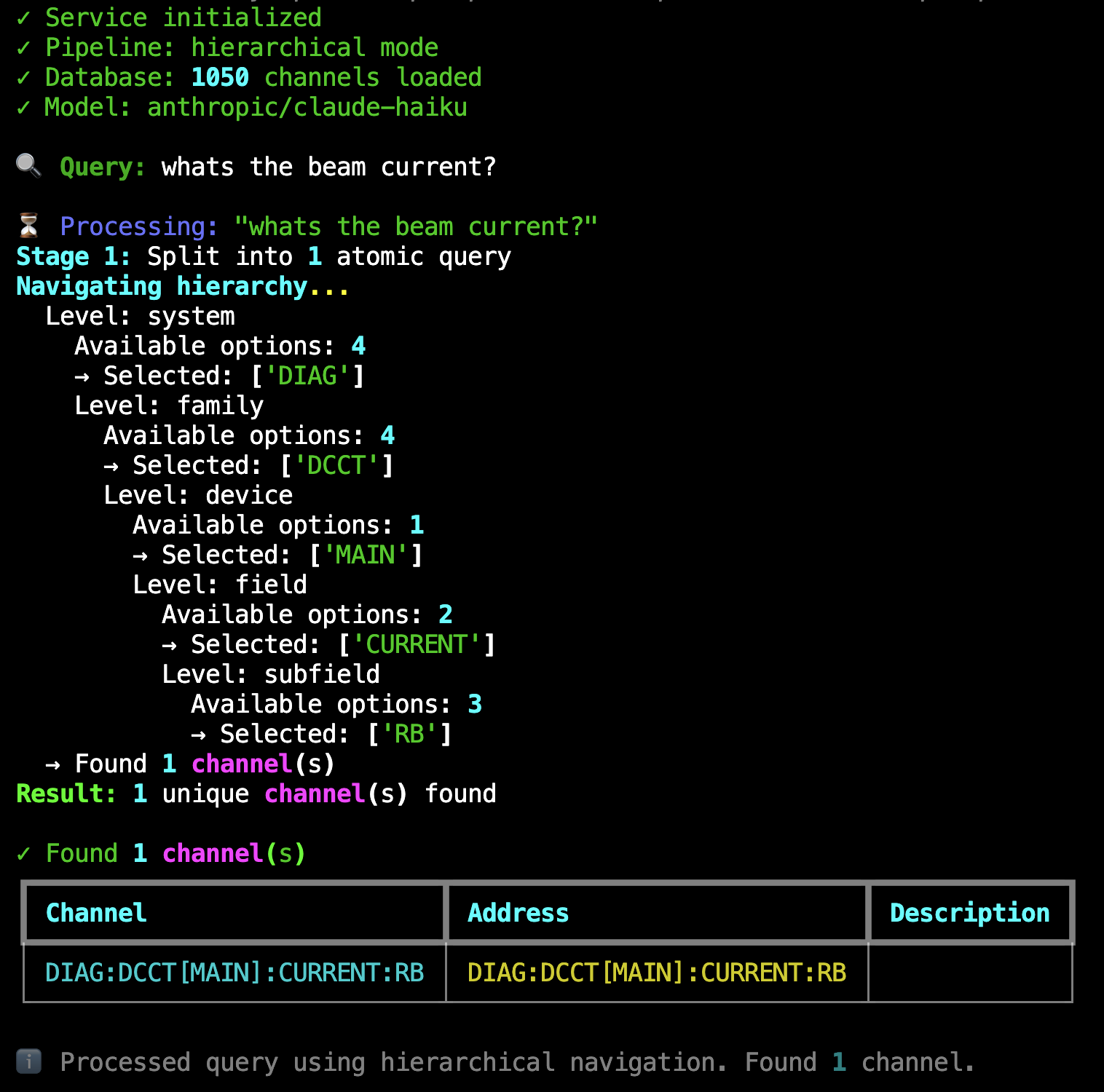 Semantic channel finding solves this by using LLM-powered pipelines to translate natural language queries into specific control system addresses. Instead of requiring users to memorize technical names or browse through documentation, they can ask for what they need in their own words. The system understands the semantic meaning and finds the correct channels, even when query terminology doesn’t exactly match the database.