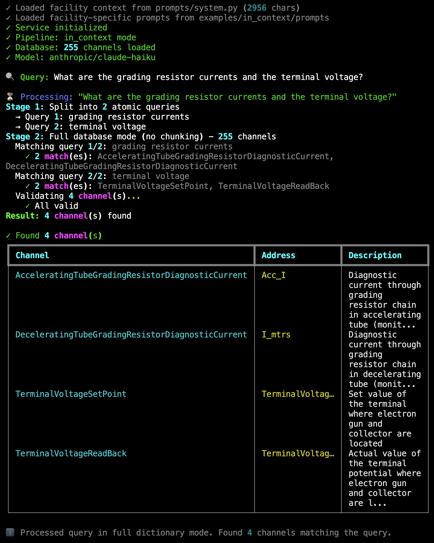 Live Example: In-context pipeline processing “What are the grading resistor currents and the terminal voltage?” — Shows query splitting into 2 atomic queries, full database mode with 255 channels, matching 4 results (2 grading resistor currents + 2 terminal voltages), and validation confirming all channels are valid.#