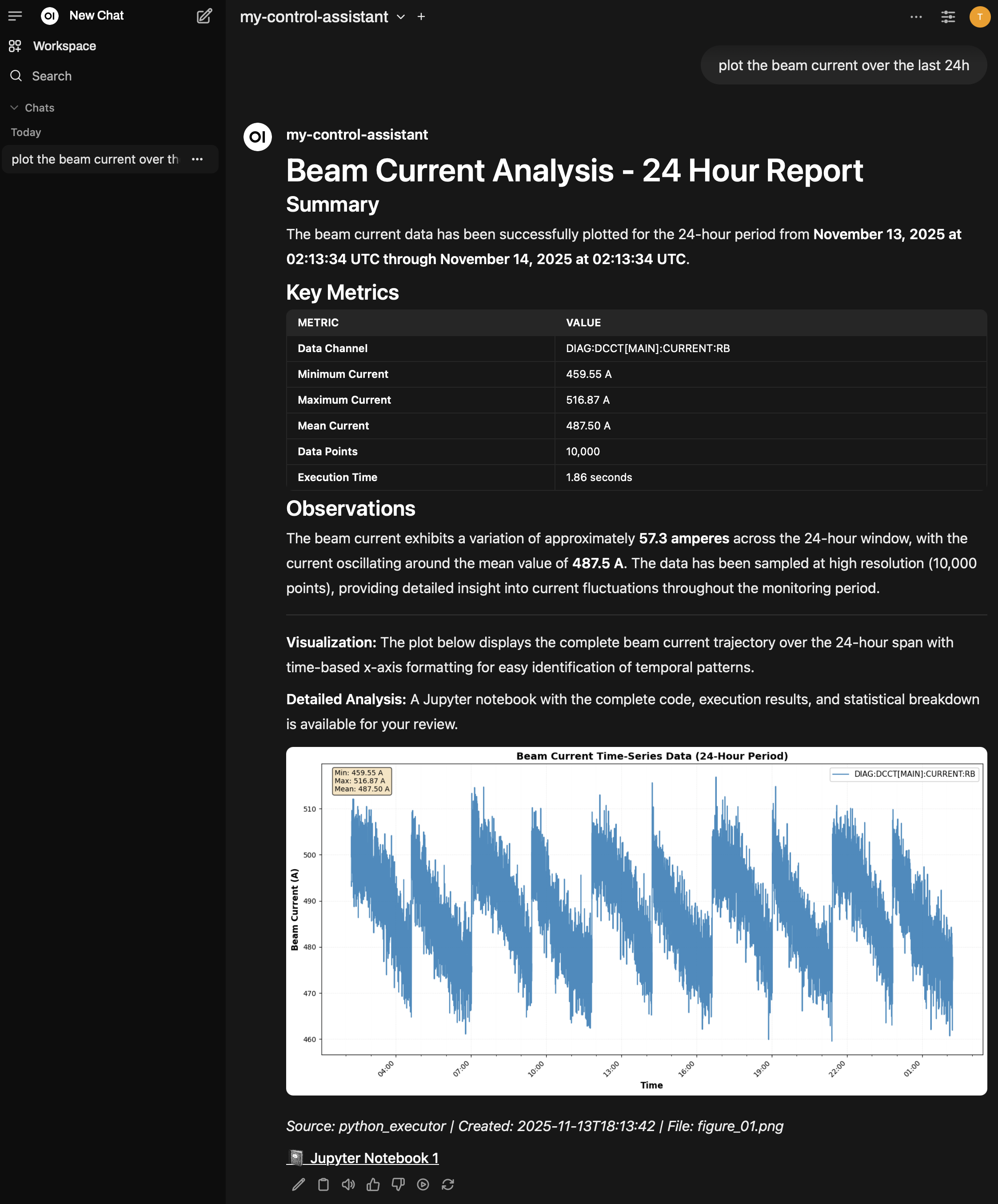 Let’s run a real multi-step query to see how the framework orchestrates complex tasks. We’ll plot historical beam current data over 24 hours - a query that requires channel finding, time parsing, archiver data retrieval, and visualization.